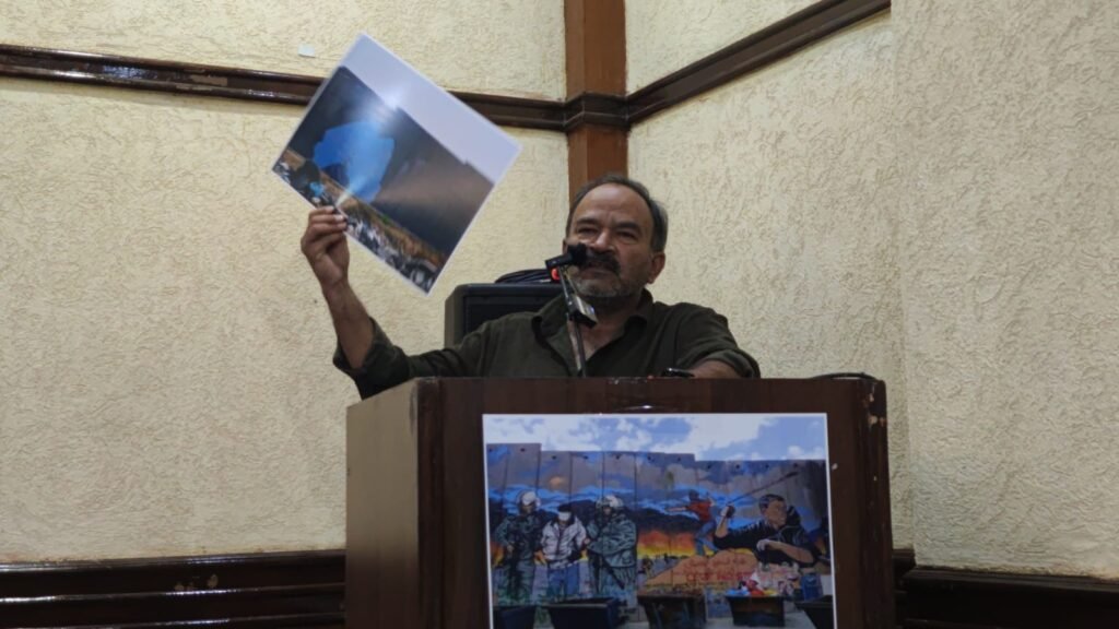 Poet Vineet Tiwari gave an illustrated talk based on his very recent visit in November to the land of Palestine. He shared his many insights gained by talking to the impacted by the brutal rule of the Isdraelis, implemented through their army and settlerst.